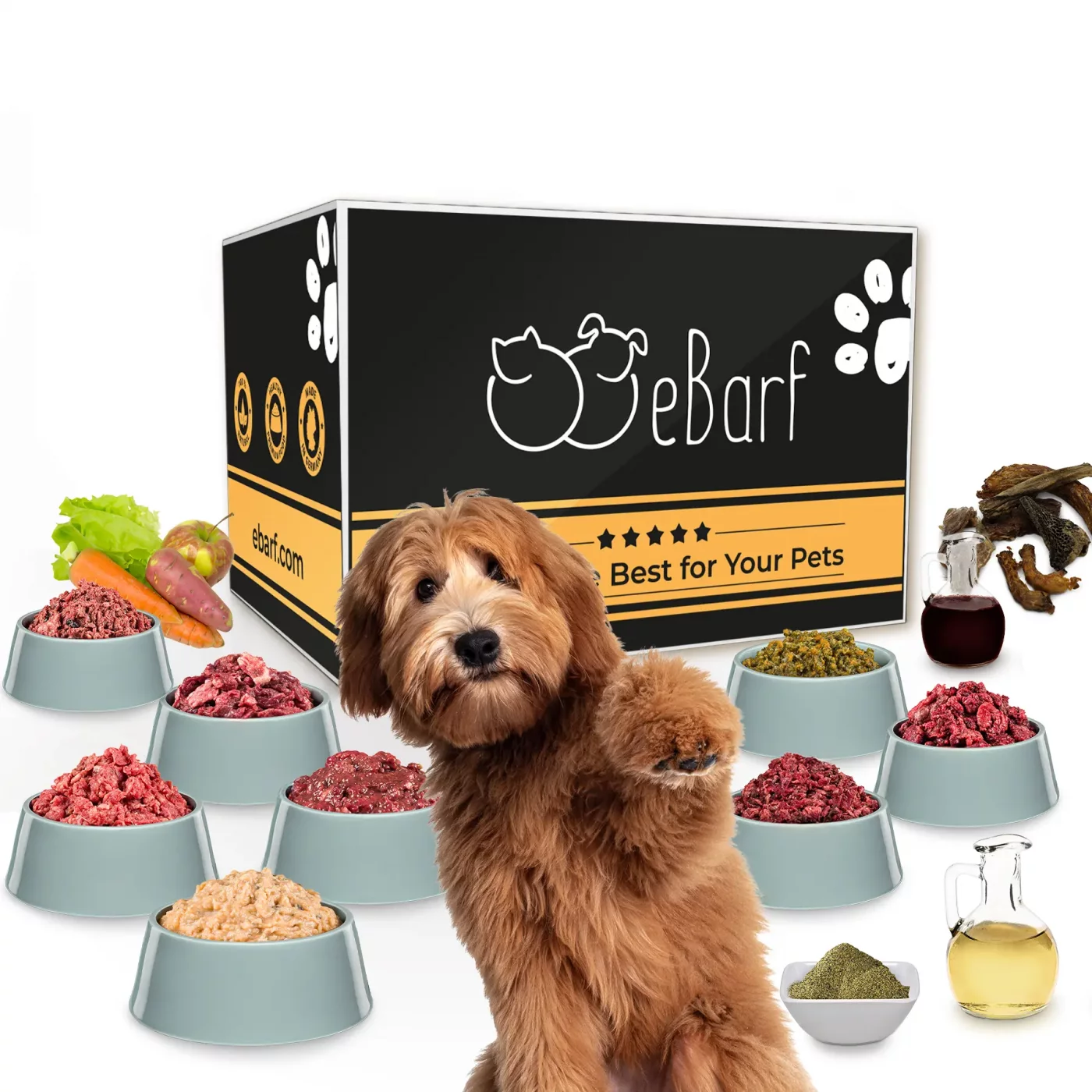 Pakken indeholder højkvalitets oksemuskelskød, nærende BARF-menuer, lækker fisk, næringsrige organer, brusk og knogler samt blandinger af grøntsager og frugt. For at sikre, at din hund får alle essentielle næringsstoffer, inkluderer pakken også vigtige kosttilskud som vores Omega-3-6-9 olie, blod og tangmel. Og fordi en sund kost ikke er komplet uden en snack, er vores populære tyggeblanding også en del af pakken.