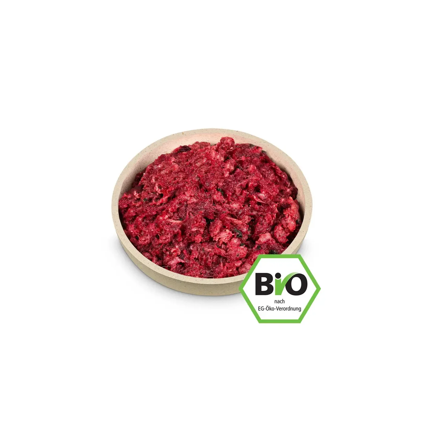 Dit BARF-compleet menu is bereid met hoogwaardig biologisch rundvlees uit Duitsland, waardoor het een echte traktatie is voor je kat. Vooral katten die allergisch zijn voor andere eiwitbronnen kunnen dit rauwe voer zorgeloos genieten: stukken vlees van biologische rundernek, biologisch runderhart en mager biologisch rundvlees zijn ideaal om op te kauwen en bevorderen tegelijkertijd de gebitshygiëne. Natuurlijke ingrediënten zoals biologische rundermilt en bloed voldoen aan de ijzerbehoefte van je kat, terwijl een extra portie vet de nodige energie levert.
